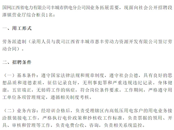 ->查看國網江西省電力有限公司豐城市供電分公司因業務拓展需要,現面向社會公開招聘段潭鎮營業廳綜合柜員1名:一、用工形式勞務派遣制(錄用人員與我司江西省豐城市惠豐勞動力資源開發有限公司簽訂勞動合同)。二、招聘條件(一)基本條件:遵守國家法律法規和規章制度,遵守社會公德,...