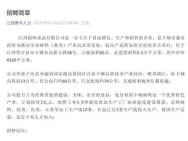 ->查看江西創味食品有限公司是一家專注于食品研發、生產和銷售的企業,是豐城市委市政府為推動全市麻鴨(禽類)產業高質量發展,提高產品附加值引進的重大項目,位于江西省宜春市豐城市高新五路18號,占地面積65畝,總建筑面積5.3萬平方米,其中冷庫4320平方米。公司坐落于風...